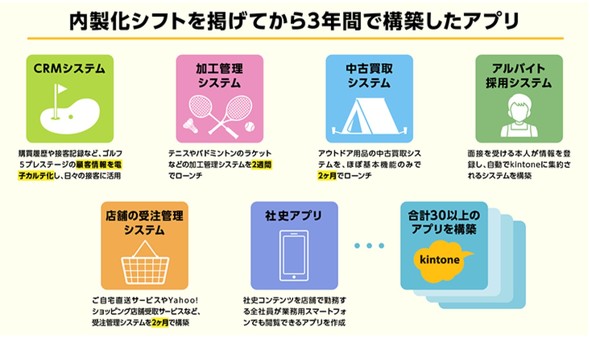 また、ラケット等の加工管理システムもkintoneを使ってわずか2週間で、店舗の受注管理システムとECシステムを連携させる仕組みも2カ月で開発し、「OMO」(Online Merges with Offline)の取り組みを加速させている。同グループはこのような内製化による業務改善を進め、2023年1月時点で65個の業務システム(=アプリ)をkintoneで構築している。