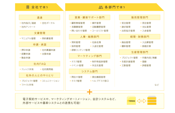 kintoneは自社に合ったシステムを容易に作成できるノーコード/ローコードツールだ。システム開発に必要なプログラミングコードの知識や経験は必要なく、直感的な操作で業務に必要なアプリを構築できる。