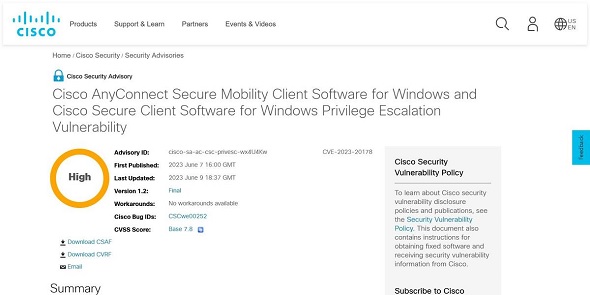 Windows向けの「Cisco AnyConnect Secure Mobility Client Software」と「Cisco Secure Client Software」の脆弱性に関するPoCが公開された(出典:Cisco SystemsのWebサイト)今回PoCが公開された脆弱性は、Cisco Systemsが2023年6月7日(現地時間)に発表していたもので「CVE-2023-20178」に特定されている。CVSSスコア値は7.8で深刻度は「重要」(High)に分類される。