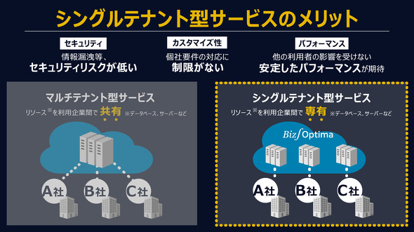 本製品の特徴は、シングルテナント(個社専有型)で提供することだ。同社の村井次郎氏(カスタマーサクセス部 シニアマネージャー)は、「クラウドサービスでありながらデータベースやサーバなどをユーザー企業が専有することで情報漏えいのリスクを減らし、個社要件によるカスタマイズも可能にした」と説明する。