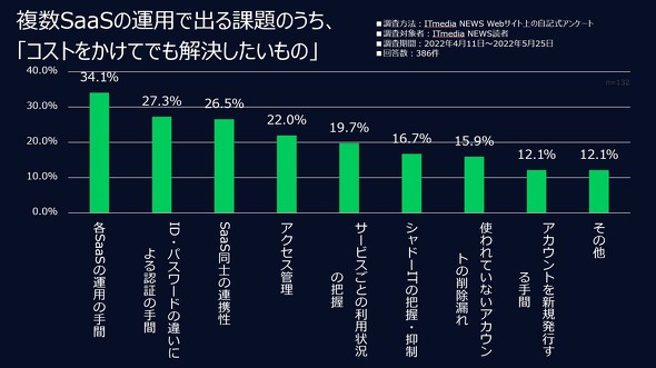 内野が紹介したアイティメディアの読者調査結果によると、複数のSaaSを利用する企業が増える中で、IT部門では「運用の手間」や「ID・パスワードによる認証の手間」などの課題について「コストをかけてでも解決したい」というニーズが高い。