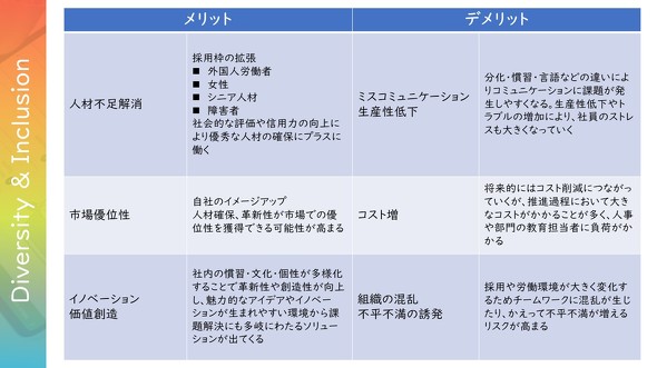 「D&Iは“新結合”だ。イノベーション理論を確立したヨーゼフ・シュンペーター氏が提唱する『イノベーションを起こしやすくする環境』『人の育成』『文化の創生』に効果がある。同じマインドやスキルセットを持つリソースが集まると、視野が狭くなり未来を俯瞰(ふかん)することが難しくなる」