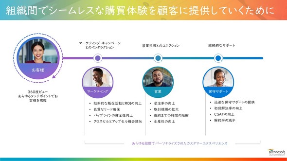 CRM機能群は、ユーザーに一貫した購買体験を提供するのに有効です。自社の各部門でユーザーとのタッチポイントを適切に収集し、あらゆる組織でこれらの情報を活用できれば、図6のような効果を得られます。