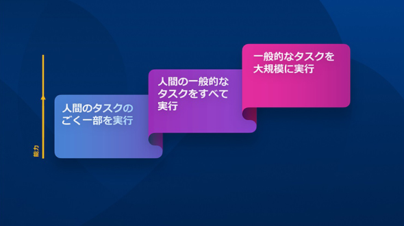 「AIは、これまで人間のタスクのごく一部を実行することしかできなかった。それが今、生成AIが使われるようになって、人間の一般的なタスクを全て実行できるようになってきた。そしてこれからは、一般的なタスクを大規模に実行できるようになるだろう」(図1)