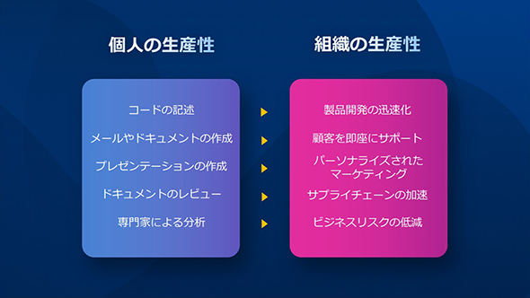 では、個人の生産性向上を企業や組織の生産性につなげるためにはどうすればよいのか。同氏は個人の生産性を高める要素として、コードの記述、電子メールやドキュメントの作成、プレゼンテーションの作成、ドキュメントのレビュー、専門家による分析を挙げた。それを企業や組織の生産性を高める要素である、製品開発の迅速化や顧客を即座にサポートする、パーソナライズされたマーケティング、サプライチェーンにおけるDXの進展、ビジネスリスクの低減につなげるためにはどうすればよいかというわけだ(図2)。