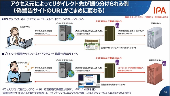 今回紹介されている誘導経路には、多くが「Web広告」が関係しています。本来であれば、広告を配信、管理する企業、そして広告を表示するメディア側で対処をする必要があると思います。ただ、このレポートでも触れているように、悪意あるものはアクセス元をしっかり見て、広告配信業者やメディアによるチェックではないことを判定し、悪意ある偽警告画面を表示しており、「良い広告だけを表示する」ということが難しいことも理解できます。だからといって免責はされないとは思いますが……。