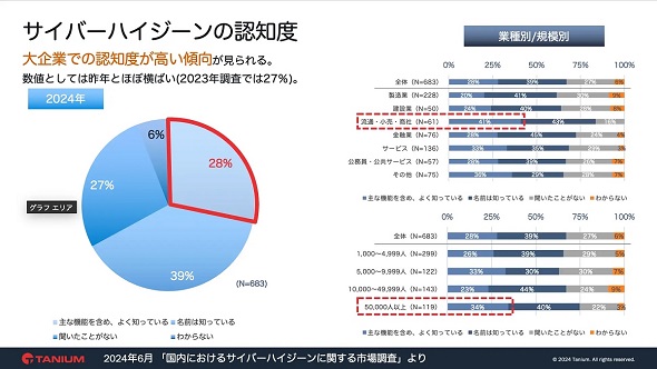 「サイバーハイジーンを認知している」と回答した割合は全体の67%で、「主要な機能を含めてよく理解している」という回答は28%と、前年と同様の結果となり、サイバーハイジーンの認知は2022年から大きく変化していないことが分かった。