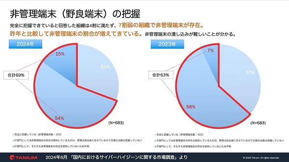 この他、環境内の端末について「完全に把握できている」と回答した組織は31%と、前年の37%から減少しており、約7割の組織で非管理端末が存在することが分かった。