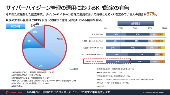 タニウムによると、1万人未満の企業においてはその割合が32%、5千人未満の企業においては34%と、前年同様に企業規模による差が見られ、従業員規模が大きくなるほど実施している割合が高くなる傾向が見られたという。