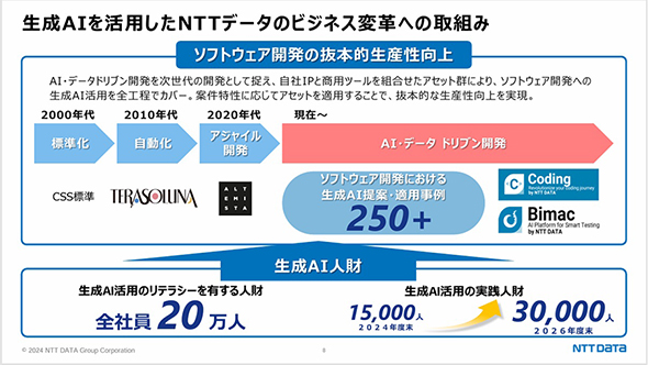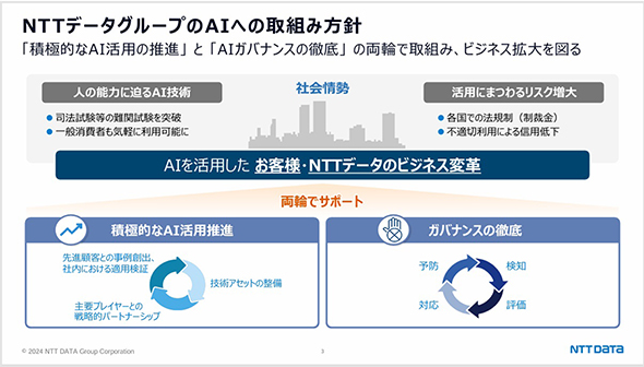 「NTTデータグループはAIの取り組み方針について、『積極的なAI活用の推進』と『AIガバナンスの徹底』の“両輪”で進めている」