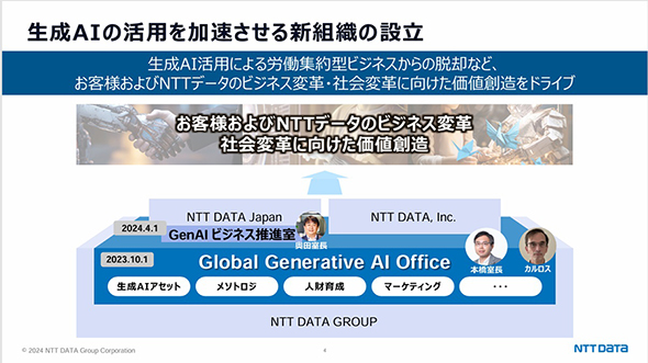 その取り組みを推進する組織として、NTTデータグループは「Global Generative AI Office」(日本名では「Generative AI推進室」)を2023年10月に設立し、2024年4月には国内事業会社であるNTTデータ内にも「GenAIビジネス推進室」を設けた。この組織が生成AIを活用して、社内および顧客のビジネス変革や社会変革に向けた価値創造をドライブする役割を担う(図2)。