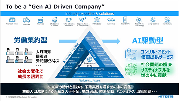 同社は生成AIを活用する企業として、どのような企業像を描いているのか。本橋氏は、「当社が生業としてきたSI(システムインテグレーション)事業は『労働集約型』のイメージが強い。その中身を『AI駆動型』に変えていくことによって作業を効率化し、さまざまな社会課題を解決していける企業を目指したい」と述べた(図3)。