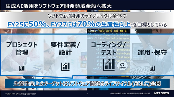 また、本橋氏は「ソフトウェア開発は要件定義や設計、コーディングやテスト、運用や保守、それら全体のプロジェクト管理で構成されているが、当社ではこれらのライフサイクル全体に生成AIを活用することによって、2025年度には50%、2027年度には70%の生産性向上を目標としている。他社ではコーディングへの適用だけで生産性向上を強調しているところもあるが、それでは不十分だ」とも説明した(図5)。