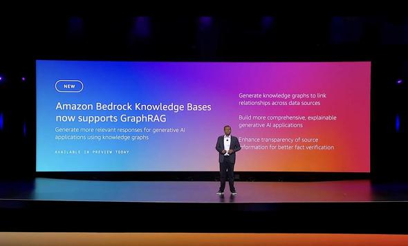 Amazon Web Services(以下、AWS)は2024年12月2〜6日(現地時間)にかけて、米ラスベガスで年次イベント「AWS re:Invent 2024」を開催した。Day2の基調講演では、同社でAIおよびデータ担当バイスプレジデントを務めるスワミ・シヴァスブラマニアン氏が登壇し、AWSにおけるAI関連の取り組みと、18個の新サービスについて発表した。本稿は18の発表の中でももっとも情報が多かった「Amazon Bedrock」のアップデートをまとめる。