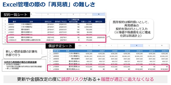 Excelによるリース会計の計算は、単純な契約情報に応じた計算となりがちで、再見積のような「変化」「変更履歴」を加味するのは非常に難易度が上がります。その結果、変更時に「別の行として残高を計算しなおして追加」のような処理をせざるを得なくなり、ミスの可能性が非常に高くなります。