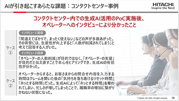 人の気持ちに寄り添ったAIエージェントの必要性について、吉田氏はコンタクトセンターの事例としてAIが引き起こす課題について図2を示した。