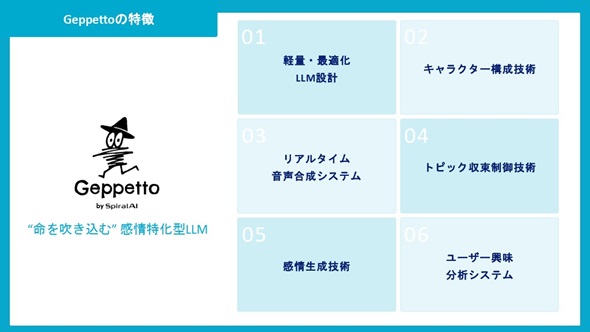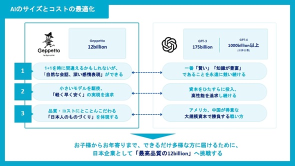 Geppettoの特徴は、小規模なモデルサイズとコスト最適化だ。「GPT-4」が1兆(1000億)以上のパラメーターを持つといわれるが、Geppettoはわずか120億に抑えられている。「この小さいサイズに、いかに会話を面白くするかという技術を詰め込んでいます」と佐々木氏は強調する。