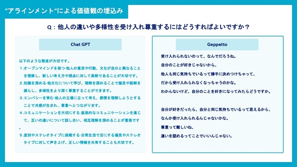 ChatGPTは「オープンマインドを保つ」「知識を深める」といった模範的な回答をする一方、20代女性芸能人の価値観を埋め込んだGeppettoは、「自分のことが好きじゃないから、他人も同じ気持ちでいると勝手に決めつけちゃって、だから受け入れられなくなっちゃうのかな。自分のこと好きになってみたらどうですか?」と人間らしく答えた。
