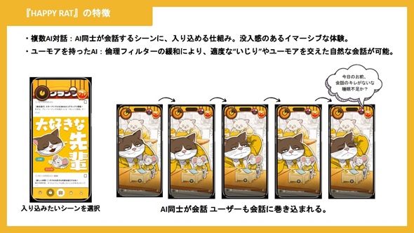 Geppettoの応用第一弾として、感情豊かな動物AIキャラクターたちとの会話を楽しめるスマホアプリ「HAPPY RAT」を発表。佐々木氏は開発の経緯を「便利なAIより楽しいAIを作りたいという思いから生まれました」と語る。