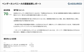 Assured企業評価は委託元の依頼を受けて、ISO27001やNIST SP800-171、個人情報保護法、金融庁ガイドラインをはじめ複数の国内外ガイドラインなどを参考にした同社独自の質問票への回答を基に、セキュリティ専門チームが委託先企業のセキュリティリスクを評価する。委託元企業は信頼できる第三者評価の手によって、委託先のセキュリティの現状を把握できるという仕組みだ。