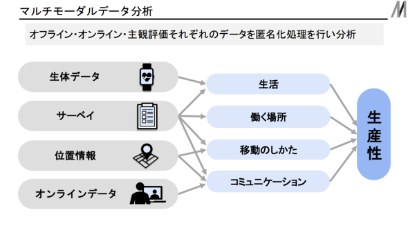 では、オフィスと生産性の関係を解明するために、両社はどのようなアプローチで研究を進めていくのか。本研究では、従来のオフィス稼働データや主観的なパフォーマンスサーベイデータに加え、以下のマルチモーダルなデータを統合的に分析する。