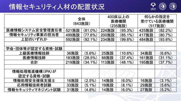 若村氏: 同調査は地域の病院を含めた643の医療機関から回答を得たものです。医療情報システムの安全管理責任者や情報セキュリティ事案の担当者、有資格者など、責任者や現場担当者が医療機関の規模や機能ごとにどの程度配置されているかを調べています。