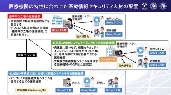 医療情報セキュリティ人材が持つべき知識やスキルセットを3つのグループに分けて定義する(出典:厚労省「安全な地域医療の継続性確保に資する医療機関における情報セキュリティ人材の育成と配置に関する研究」における研究代表者である武田理宏氏の公開資料)若村氏: 医療機関向けセキュリティ教育支援ポータルサイトといった教育支援体制の拡充も進めているので、こうした支援の基に医療情報セキュリティ人材人材を育成し、医療機関の特性に合わせて配置して同時にキャリアパスも構築していこうという動きですね。