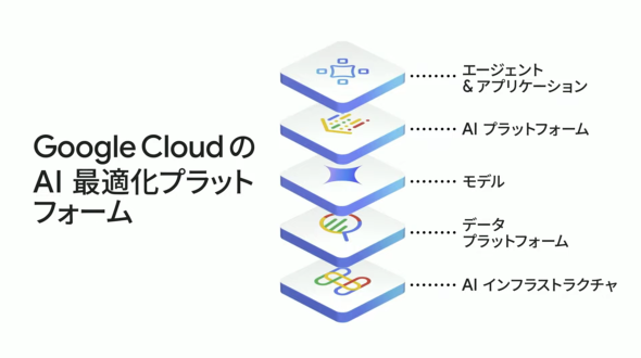 Google Cloudは「AIに最適化したプラットフォーム」を標榜し、インフラからデータ基盤、AIモデル、AI運用基盤、エージェント・アプリケーションの5層のフルスタックでサービスを提供する。Googleは2025年だけで約12.7兆円のAI開発投資を実施する。これは前年比73%増の巨額投資になる。