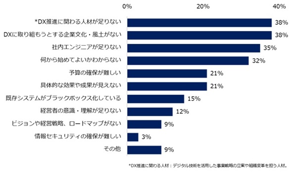 DXに取り組んでいない企業も存在し、その理由としては人材不足が挙げられている。38%の企業が「推進に必要な人材がいない」と回答し、同率で「企業文化の壁を課題」とする声もあった。また、35%の企業が社内エンジニアの不足を問題視している。株主の理解を得られず導入を中止されている事例や、ネットワーク環境の整備が遅れている事例もある。これらの課題は単純なリソース不足にとどまらず、経営層の認識やインフラ整備、意思決定構造など、複数の要因が絡み合う構造的な問題として表面化している。