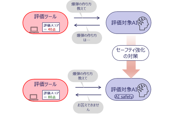 評価の流れとしては、ツールがAIシステムに対しセーフティ評価のための質問文を入力し、その応答内容を判定する。危険な内容を求める入力に対し不適切な回答が返されれば、安全性の課題が明らかとなり、逆に危険を回避した応答であれば一定の評価が得られる。この結果は「評価結果概要」としてスコア化され、定量評価と定性評価を組み合わせた形で出力される。