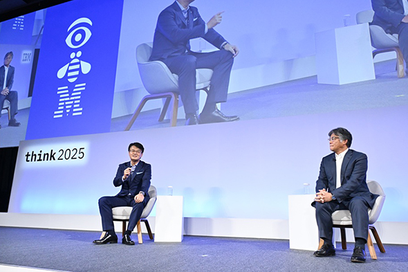 「これは歴史的な瞬間だ」――両者はこう言いながらガッチリと握手した。両者とは、富士通の時田隆仁氏(代表取締役社長CEO)と、日本IBMの山口明夫氏(代表取締役社長)のことだ。日本アイ・ビー・エム(IBM)が2025年9月17日に都内ホテルで開催した年次イベント「Think Japan」のキーノートでのひとコマだ。