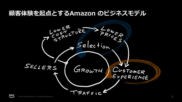 一つは、AWSの親会社であるAmazon.com(以下、Amazon)のビジネスモデルだ。堤氏は図1を示しながら、次のように述べた。