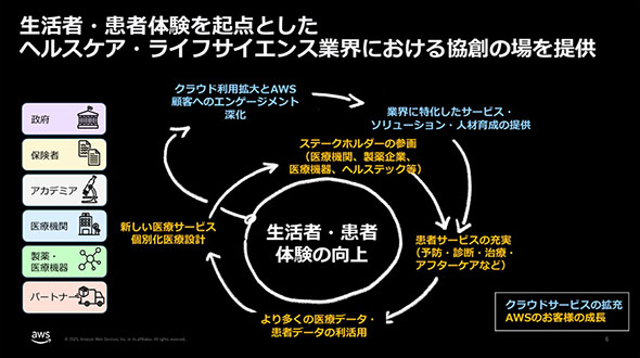 流れとしては、生活者・患者体験を起点にクラウド利用拡大とAWS顧客へのエンゲージメントを深化させ、業界に特化したしたサービス・ソリューション・人材育成を提供することにより、患者サービスの充実を図る。すると、より多くの医療データ・患者データを活用できるようになり、新しい医療サービスや個別化医療を設計できるようになる。そうすれば、多くのステークホルダーが参画するようになり、患者サービスが充実するといった具合だ。