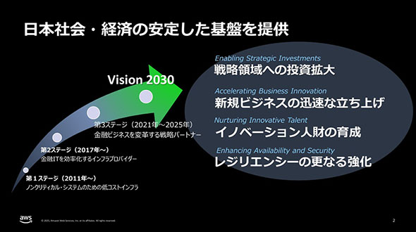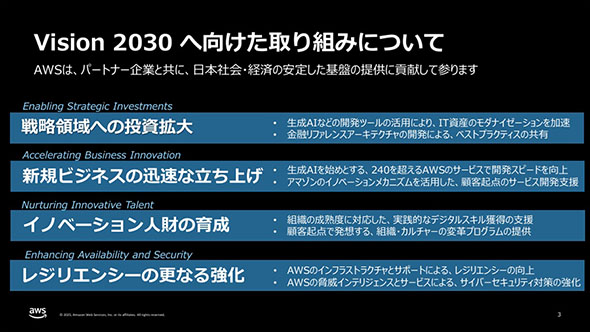 2030年に向けた戦略ビジョンについては、金融向けの会見でも掲げられていた。AWSの金融向けの戦略について説明したAWSジャパンの飯田哲夫氏(金融事業開発本部 本部長)によると、「Vision 2030」はこれまで同社が展開してきた金融向け事業戦略の発展形として位置付け、顧客の事業課題に着目して「戦略領域への投資拡大」「新規ビジネスの迅速な立ち上げ」「イノベーション人財の育成」「レジリエンシーのさらなる強化」の4つの取り組みを支援している(図5)。