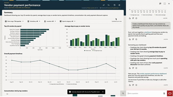 例えばAsk Oracleに「請求書の支払いにかかる平均日数を表示」と依頼すると、月別の平均支払い日の推移をグラフで表示し、上位支払額のベンダーについて支払い期間がどう変化しているかを示すことも可能だ。経理担当者はこの分析を見て、すぐに具体的な対策を進められる。