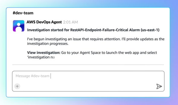 「AWS DevOps Agent」はシステムに問題が発生した際に自律的に検知し対応するエージェントだ。「Amazon CloudWatch」や「Datadog」「Splunk」などのオブザーバビリティーツール、ドキュメント、コード、CI/CDパイプライン構成、過去のインシデントのパターンなどの情報を基に動作する。