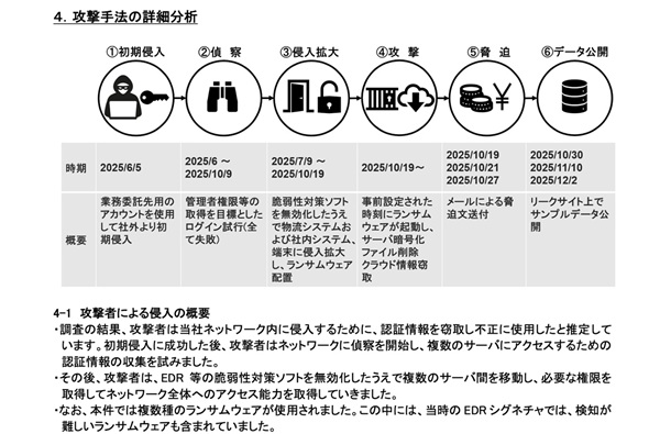 同レポートでは事件の時系列や、漏えいが確認された情報が公開されましたが、個人的に最も気になったのは攻撃手法の分析部分です。今回の攻撃では侵入拡大フェーズにおいて「EDRなどの脆弱(ぜいじゃく)性対策ソフトを無効化した上で物流システムおよび社内システム端末に侵入拡大し、ランサムウェア配置」が起きたと説明されています。