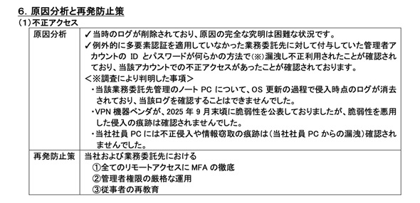 今回の原因分析と再発防止策においては、なぜID/パスワードが漏れたのかについては「原因の完全な究明は困難」としつつ、「例外的に多要素認証を適用していなかった業務委託先に対して付与していた管理者アカウントのID/パスワードが何らかの方法で漏えいし不正利用されたことが確認されており、当該アカウントでの不正アクセスがあったことが確認」とあります。