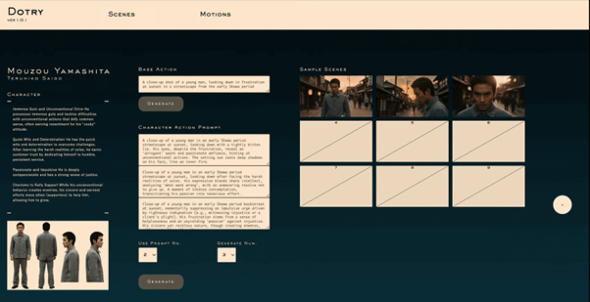 「シーンを生成する際、当初はプロンプトに逐一キャラクターの特性を記述していました。DOTRYは、例えば『夕日を背にしてうつむいているシーンを生成して』というベースプロンプトを投げかけると、キャラクターシートを基にしたアクションプロンプトの候補を複数生成してくれます。その中から自分の考えに近いものを選択し、よりイメージに近いシーンを生成できます」(篠田氏)