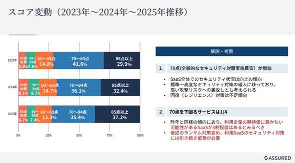 まず真藤氏が、SaaSセキュリティ評価のデータに基づいた2025年の総括と課題について発表した。同調査はAssuredが定義した評価基準に基づいて実際に評価をしたSaaSベンダーのデータ約1500件以上を分析したものだ。