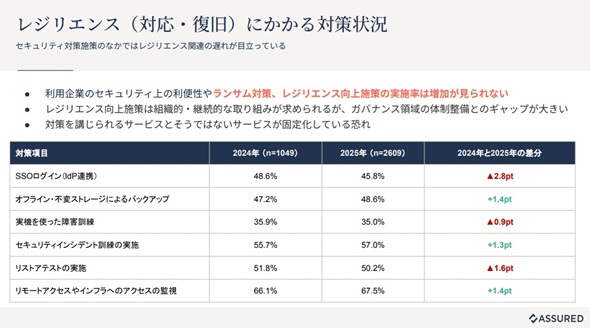 実際にランサムウェア対応として重要な「オフライン・不変ストレージによるバックアップ」といったレジリエンス対策は、いずれも半数前後のSaaSベンダーでしか実施されていない状況が確認された。真藤氏はガバナンス体制を整えている企業と、実際にレジリエンス対策を講じている企業の間でギャップがあり、対策が「固定化」してきている可能性を指摘した。