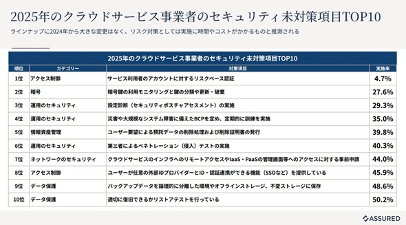 「基本的な防御策は進んでいるが、2025年に最も話題となったランサムウェアなどのサイバー攻撃を受けた際のレジリエンスの部分で、不十分なSaaSベンダーが多い。インフラやアプリケーションの脆弱性診断は約7割の事業者で実施されているが、コストや組織的な動員が必要な第三者によるペネトレーションテストや、オフラインバックアップ、障害訓練やインシデント訓練といった項目は、全体的に数字が一段、二段と落ちている」(真藤氏)