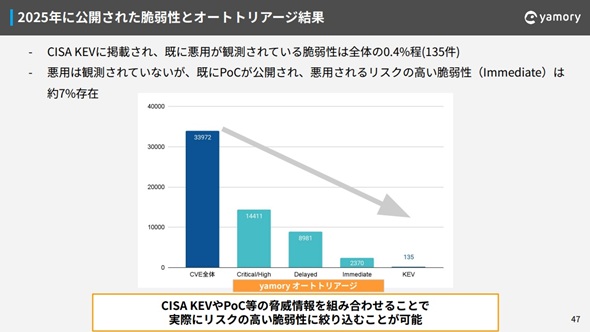 脆弱性情報が急増する中で、鈴木氏は「リスクベーストリアージ」の重要性を強調した。調査によると、2025年に公開された脆弱性(約3万件)のうち、CVSSスコアの高い「Critical/High」は約1万4000件だった。しかし実際に攻撃コードが存在するものに絞ると約2370件まで減少し、さらに米国土安全保障省サイバーセキュリティ・インフラストラクチャセキュリティ庁(CISA)による「既知の悪用された脆弱性カタログ」(KEV:Known Exploited Vulnerabilities Catalog)に載っているものとなるとわずか135件となる。