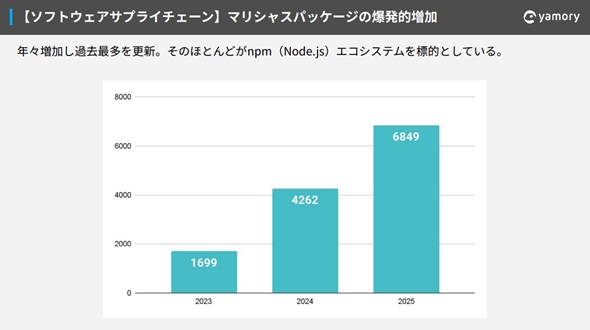この他、直近のソフトウェアサプライチェーンにおいて、特に深刻な問題となっているのが開発のエコシステムを標的とする「マリシャスパッケージ」の増加だ。