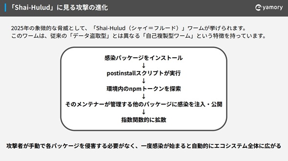 2025年には自己増殖するマリシャスパッケージ「Shai-Hulud」(シャイ=フルード)が大きなインシデントを引き起こし、複数のパッケージに汚染が広がる事態となった。