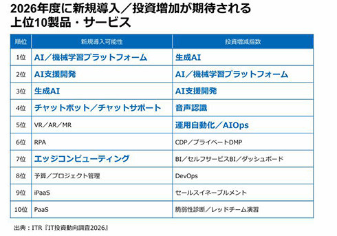 「国内IT投資動向調査報告書2026」(ITR)によれば2026年度に新規導入する可能性のある製品・サービスの項目では「AI/機械学習プラットフォーム」「AI支援開発」「生成A」が上位3つを占めた。また、投資増減指数の上位3つも「生成AI」「AI/機械学習プラットフォーム」「AI支援開発」とAIに関連する内容だった。