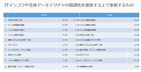 2025年冒頭に編集部が実施した読者調査によれば、短期・中長期ともIT投資の最優先事項は「AI活用」だった。この結果自体は予想通りだったが、「ITインフラ整備において重視するもの」は2024年と2025年とで大きな違いが出た。2024年はシステムの自動化や内製化が上位となった。2025年もそれらの項目は同程度のスコアとなったが、「生成AIの利用・導入」「データ活用基盤の整備」がそれらを上回るスコアとなった。