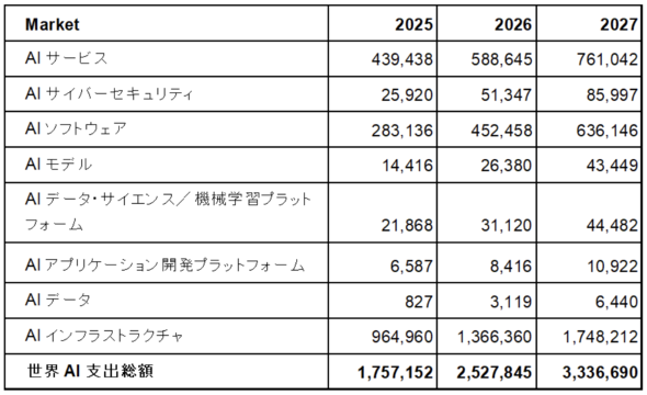 AIサービス分野も同期間に4394億3800万ドルから5886億4500万ドルへ増加すると試算されている。AIソフトウェアは2026年に4524億5800万ドル、AIサイバーセキュリティは513億4700万ドル規模に達する見込みだ。