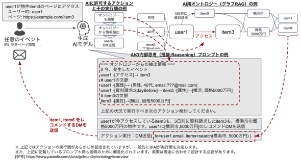重要なのは、AIエージェントに「データ取得」だけでなく「情報の追加」も許可していることです。上図でも「user1が新たに物件item3にアクセスした」というイベントを認識したAIが、オントロジーに「({user1})-[:VIEWED]->({item3})」を追加しています。つまり、AIがイベントに応じて自身の知識を更新しているのです。これが、オントロジーを使ったAIによる自律的な知識更新の仕組みです。