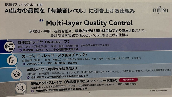 「制度改定に伴うシステム改修にかかる工数が3人月かかっていたものを4時間で完了させられる。生産性は100倍だ」ーー。2026年2月17日、要件定義から結合テストまでの一連の開発プロセスをAIが自律的に進められるプラットフォームを富士通が発表した。パートナーや顧客を巻き込んだコミュニティ化を進める。
